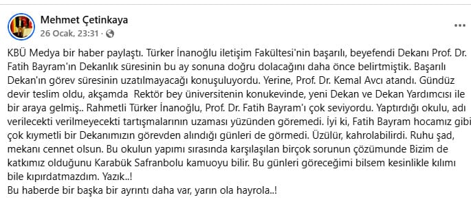 Paylaşım, Karabük Üniversitesi bünyesindeki Safranbolu Türker İnanoğlu İletişim Fakültesi’nde yaşanan dekanlık değişikliğine ilişkindi. Ancak mesele yalnızca basit bir görev değişimi değildi. Kullanılan ifadeler, satır aralarında derin bir kırgınlığı ve ciddi bir hayal kırıklığını barındırıyordu.